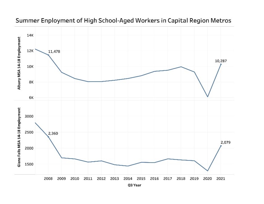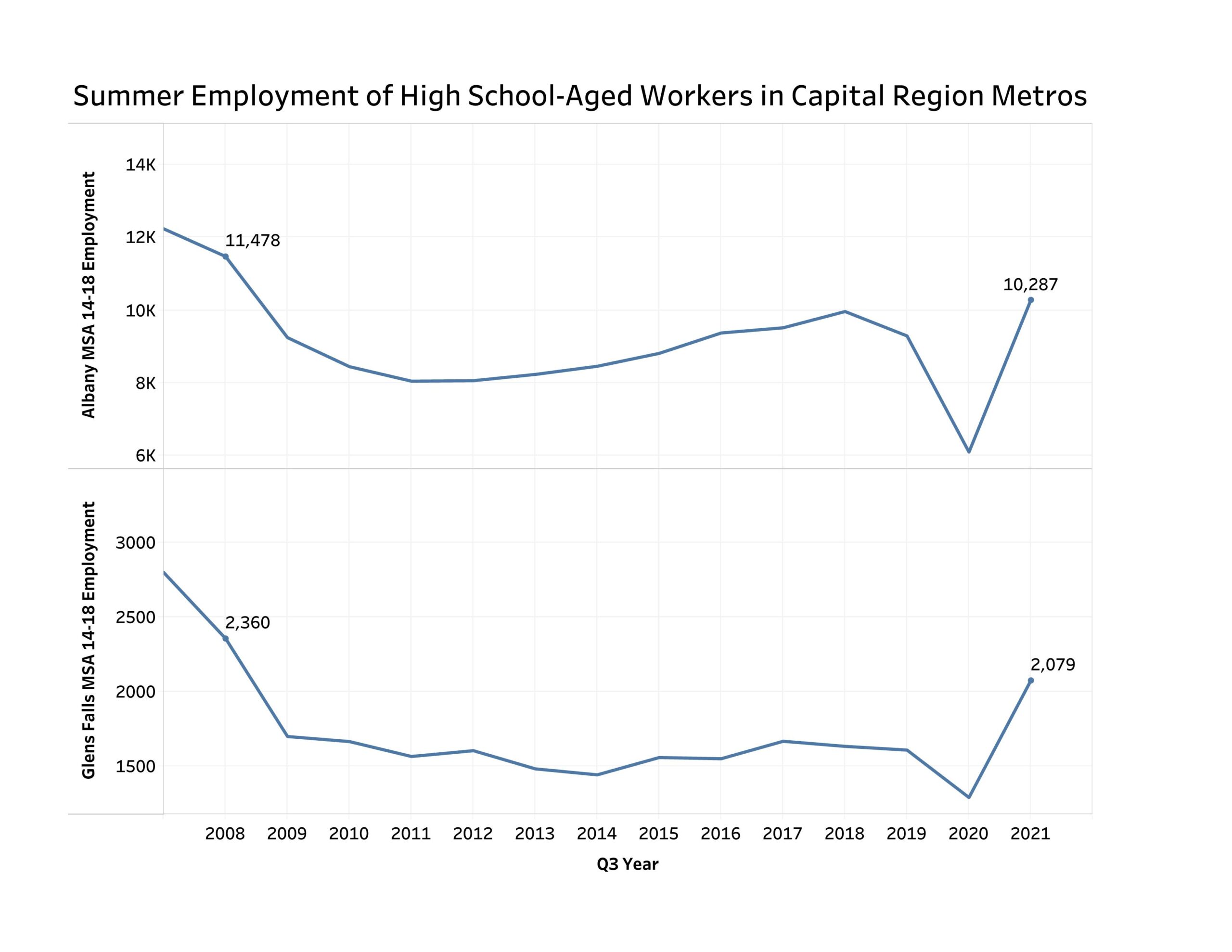 In the third quarter of 2021, there were 10,287 employed 14 to 18 year olds in the five-county Albany-Schenectady-Troy metropolitan statistical area (MSA). That was an increase of 10.6 percent from the pre-pandemic level (Q3 2019) and the highest Q3 employment for this age group in 13 years. The Glens Falls MSA (Warren and Washington counties) also saw a 29 percent increase in 14-18-year-old employment to 2,079, also a 13-year high.