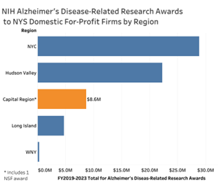Between fiscal years 2019 and 2023, Capital Region firms received $8.6 million in NIH awards (and one National Science Foundation award) for Alzheimer’s disease-related research*. That was the third largest sum among New York’s 10 economic development regions, trailing only the Hudson Valley ($22.2 million) and New York City ($28.8 million). In addition to these domestic for-profit awards, Capital Region schools, institutions and other nonprofits received $31,350,657 in funding for Alzheimer’s disease-related research – the sixth most in the state. Most Alzheimer’s disease research grants were awarded by the National Institute on Aging (NIA).