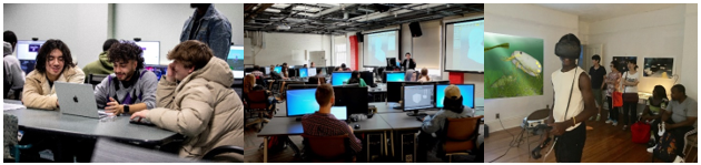 Figure 2UAAlbany students at a campus playtesting event (center), RPI students at a GSAS class, a student wears a VR headset and plays The Aquatic Messenger, by Eco Resilience Games at RPI (right).