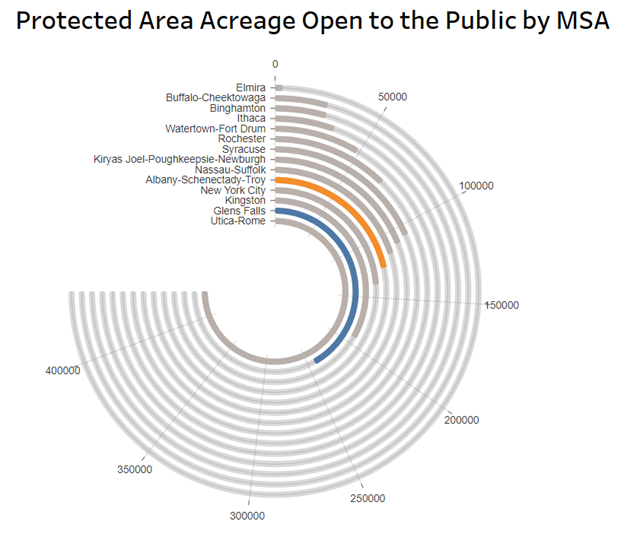 At 241,708, acres, the Glens Falls MSA has the second largest publicly accessible protected area footprint, most of which includes conservation lands in the Adirondack Park. At 433,008 acres the Utica-Rome MSA has the largest publicly accessible protected area footprint, because much of Herkimer County is in the Adirondack Park.