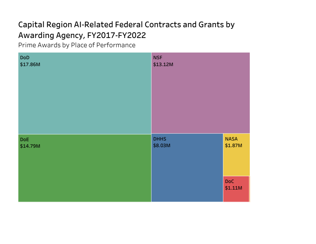 During the same period, seven federal agencies have awarded AI-related prime contracts and grants for work performed in the Capital Region. The region’s top awarding agency was the Department of Defense with $17.9 million from 16 awards. It was followed by the Department of Energy with $14.8 million from nine awards and National Science Foundation with $13.1 million from 33 awards.