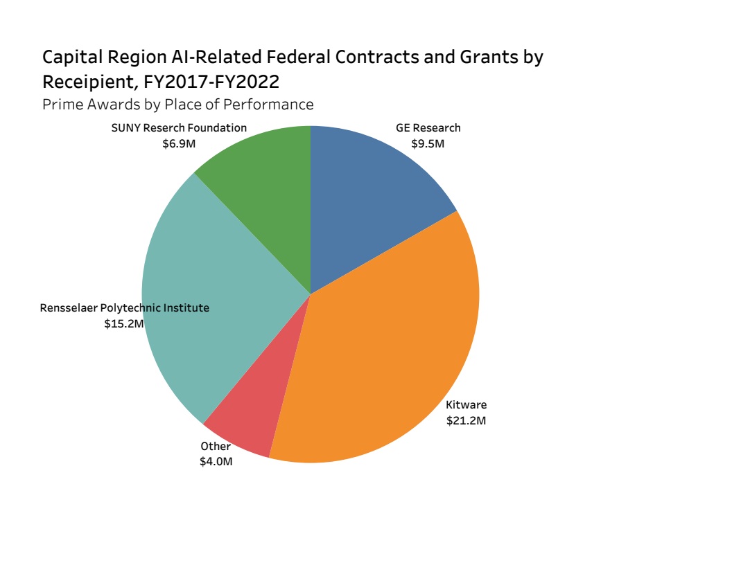 Other Capital Region recipients of AI-related contracts and grants in fiscal 2022 included Albany Medical College ($230,154), Florida A&M University ($576,471, for work performed in Troy), GE Research ($4.9 million), Health Research, Inc. ($750,000), Kitware ($3 million), and Union College ($169,044).