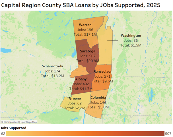 - Saratoga County led in jobs supported by SBA loans.