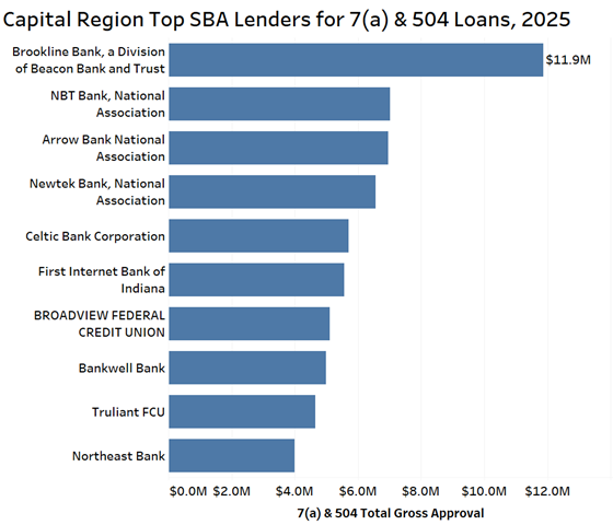 The Capital Region’s top SBA lender in 2025 was Brookline Bank, which last year merged with Berkshire Bank and recently rebranded as Beacon Bank. The gross approved amount of its five loans totaled $11.87 million. The second top SBA lender was NBT Bank at $7.01 million, followed by Arrow Bank at $6.95 million.
