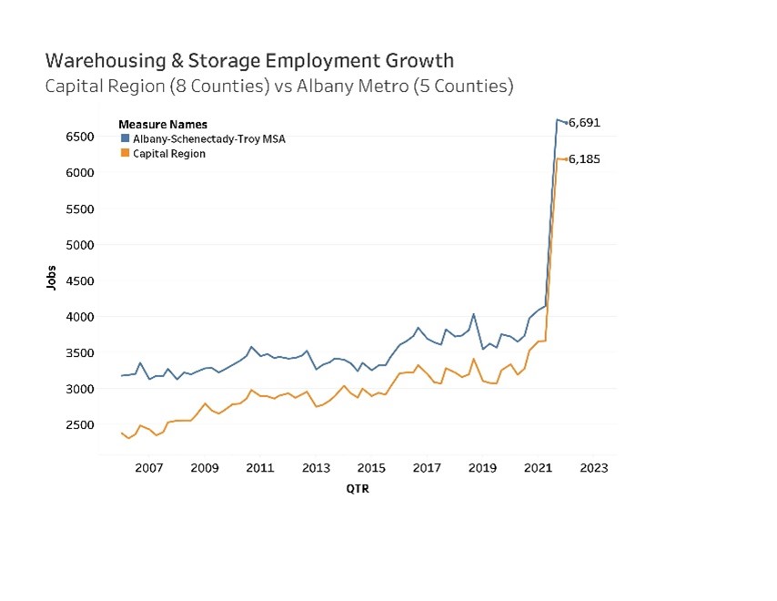 Following the completion of several massive warehousing projects, such as Amazon’s 1 million-square-foot fulfillment center in Schodack and Regeneron Pharmaceuticals’ 212,000-square-foot warehouse in East Greenbush, the eight-county region’s warehousing and storage grew to an average 6,185 jobs in the first quarter of 2022. That is 75 percent larger than Q1 2018 and double the size it was as of Q1 2016.