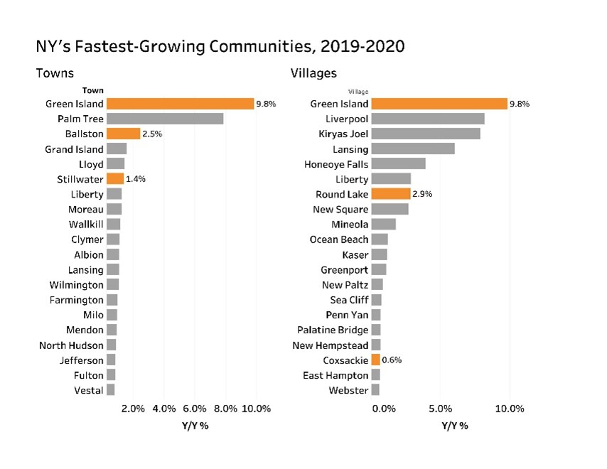 Amid the pandemic and as a transformative redevelopment project neared completion on Starbuck Island, Green Island emerged as New York’s fastest-growing town and village in 2020. Three more towns and three more villages from the Capital Region also ranked among state state’s fastest-growing communities, according to a Center for Economic Growth of new U.S. Census Bureau estimates.