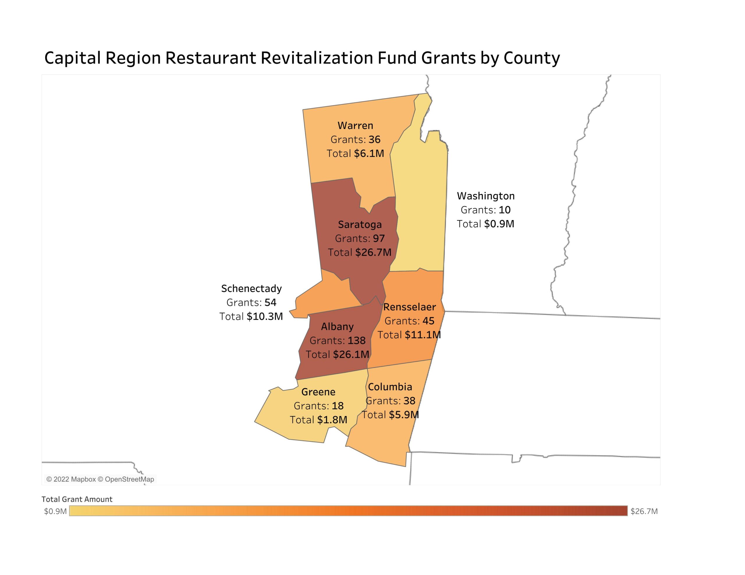 During the spring of 2021, the U.S. Small Business Administration (SBA) awarded 436 RRF grants to restaurants, bars, caterers and other food service and drinking places in the eight-county Capital Region. The RRF was established under the American Rescue Plan Act, which was enacted on March 11, 2021 and appropriated $28.6 billion to the SBA for this relief initiative. At 138 grants, nearly a third (32 percent) of the RRF awardees were in Albany County. Saratoga County had the second most grants: 97