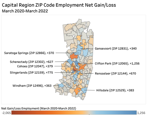 Between mid-March 2020 and mid-March 2022, nearly 100 ZIP Codes in the eight-county Capital Region experienced job growth and more than 110 had more employer establishments. The 12065 ZIP code for Clifton Park had the region’s largest employment gain (+1,256) over that two-year period. During the same period, the 12207 ZIP code that covers parts of Albany’s downtown and warehouse districts had the largest employer establishment increase (+60).