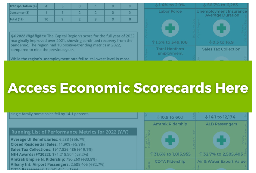 CEG’s Capital Region Economic Scorecard is a quarterly feature of the organization’s newsletter, The CEG Indicator. The scorecard tracks a dozen monthly local economic indicators to provide our investors with insights into the health of the region’s economy and the direction in which it is headed. Scores are based on each indicators year-to-date trends as of the last month of the headline quarter.