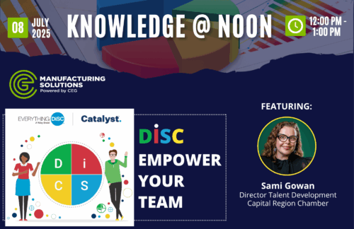 Join us for a free Knowledge @ Noon webinar on Tuesday, July 8 for DiSC: Empower Your Team featuring Sami Gowan, Director Talent Development, Capital Region Chamber.